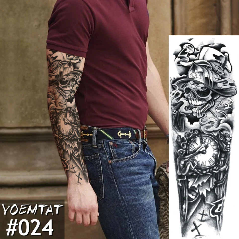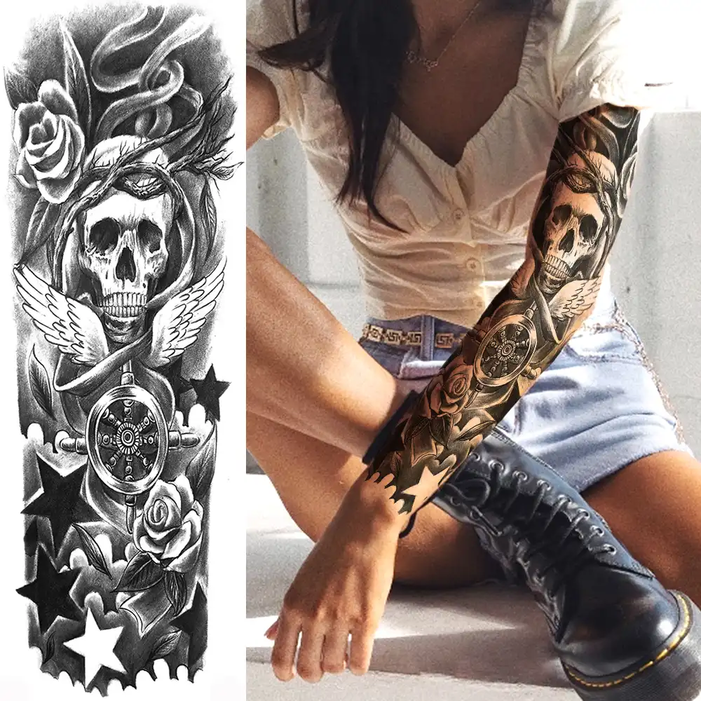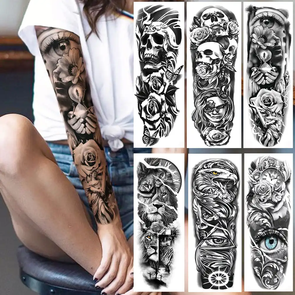 Tatouage Autocollant Temporaire 3d Waterproof Autocollant Plein Bras Mauvais œil Realiste Tete De Mort Fleur Rose Art Corporel Aliexpress