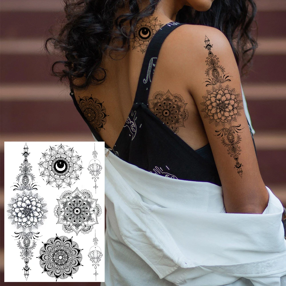 Grand Autocollant De Tatouage Temporaire En Henne Noir Fleur De Mandala Faux Tatouages D Oreilles Pour Femmes Bracelet De Cou Triangle Lotus Tatouages De Mariage Aliexpress