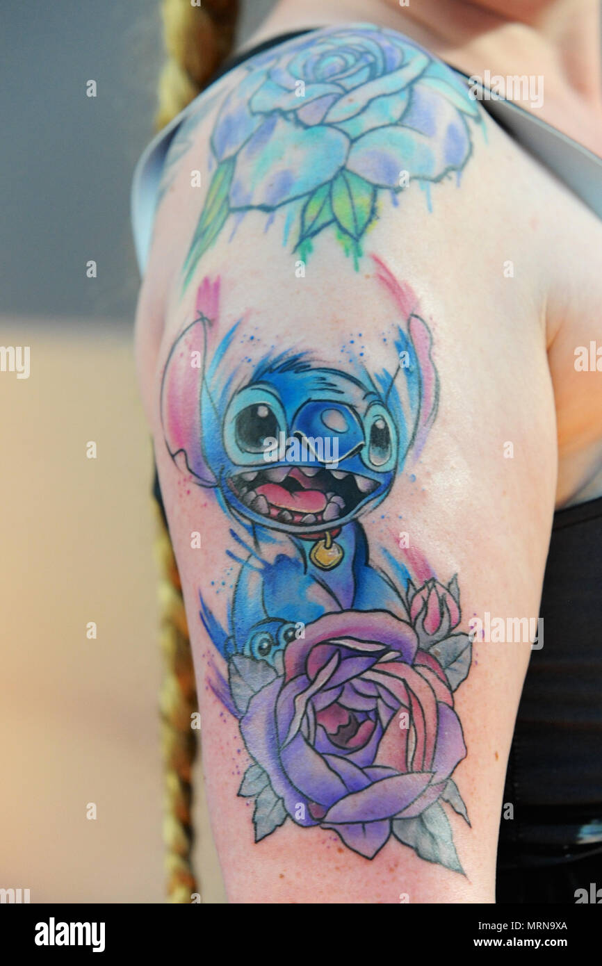 Londres Royaume Uni 26 Mai 2018 Une Femme Montrant Tatouages Bras Durant La Competition A La 5e Grande British Tattoo Show Qui A Lieu Pendant Le Week End De L Alexandra Palace Londres Royaume Uni L Exposition