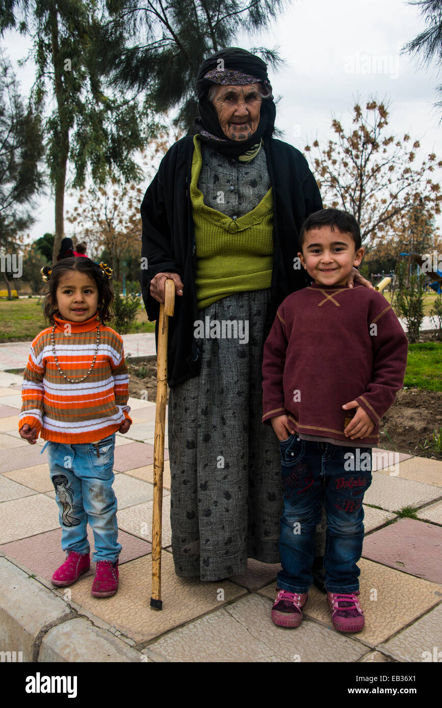 Femme Kurde Syrienne Orthodoxe De Tatouages Sur Son Visage Et Ses Petits Enfants Erbil Province D Erbil Irak Kurdistan Irakien Photo Stock Alamy