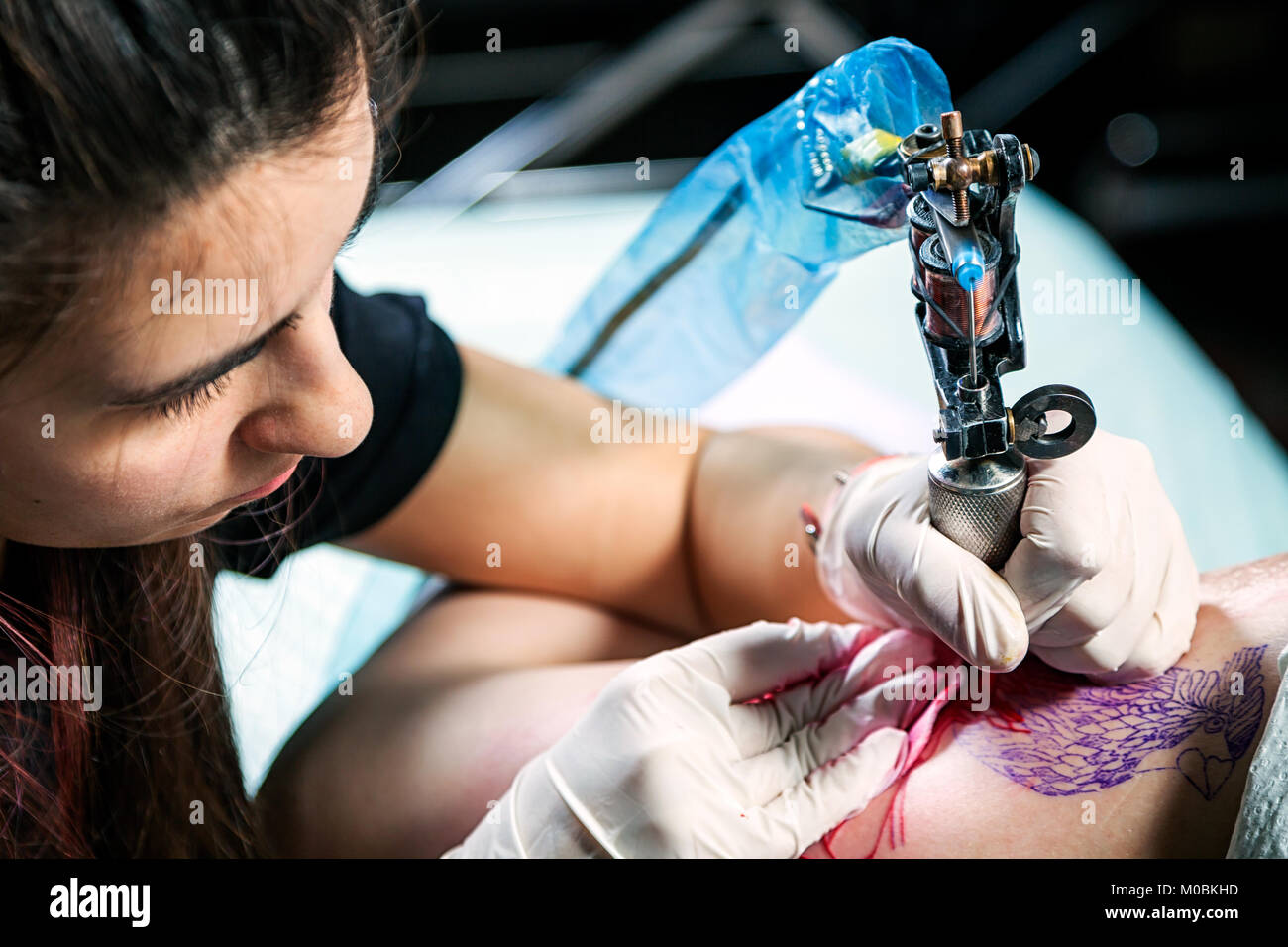 Maitre De Tatouage De Belle Femme Aux Cheveux Noirs Faisant Le Tatouage D Un Petit Oiseau Avec Une Machine A Ecrire Des Peintures Rouges Pour Un Tatouage Sur Une Cuisse De Femme Gros