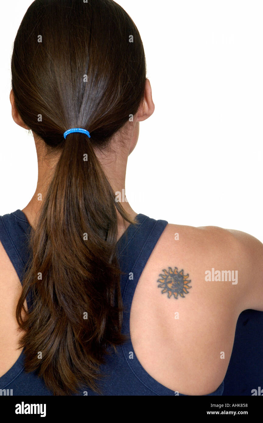 Femme Avec Le Tatouage Sur Des Epaules Et Se Sentir De Retour Etourdi Image Stock Image Du Mince Lumiere 148011763