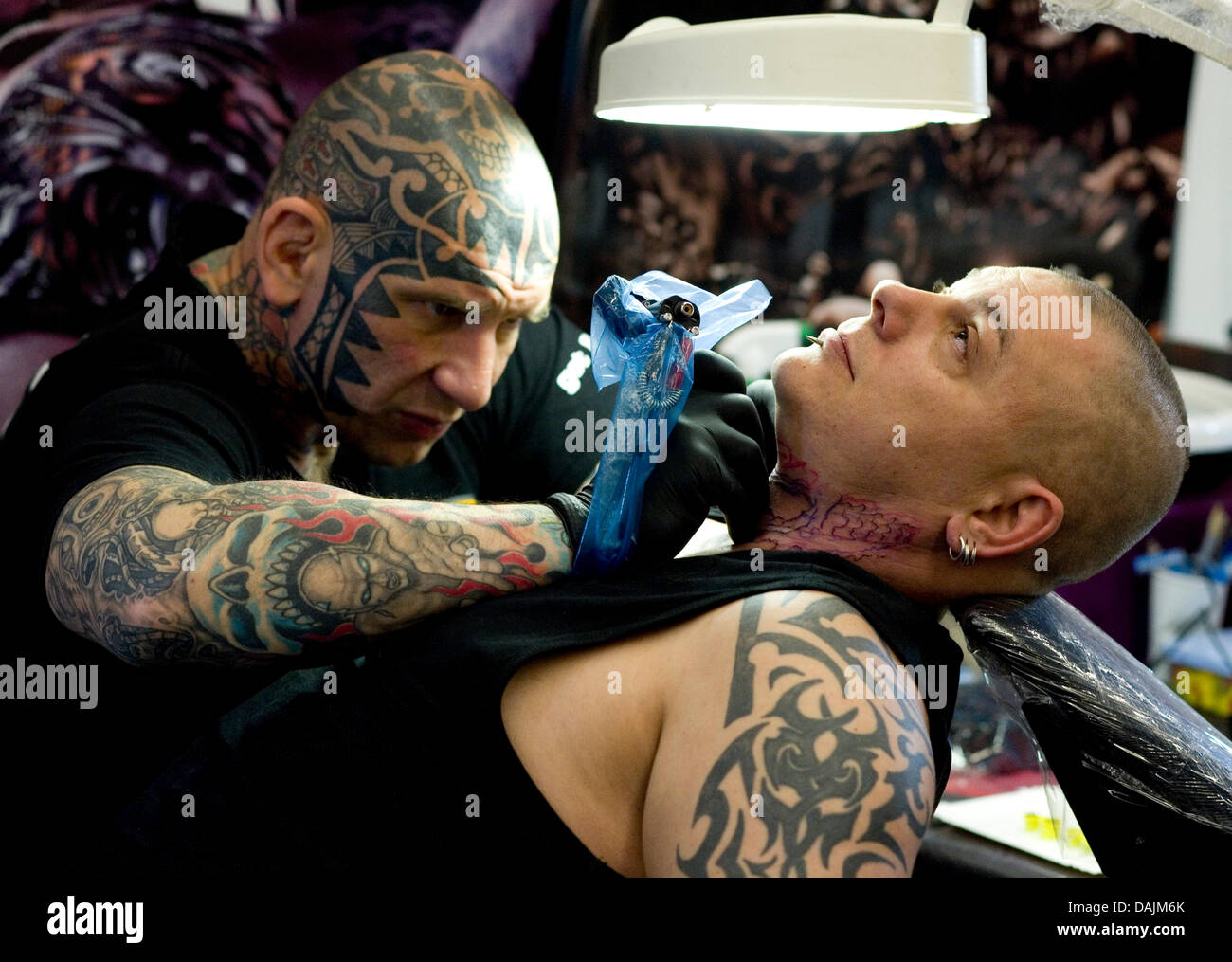 Un Homme Avec Des Tatouages Visage Tattooes La Gorge D Un Homme Au Cours Des 19thh Convention Internationale De Tatouages A Francfort Allemagne 16 Avril 2011 Plus De 700 Artistes De Tatouage De