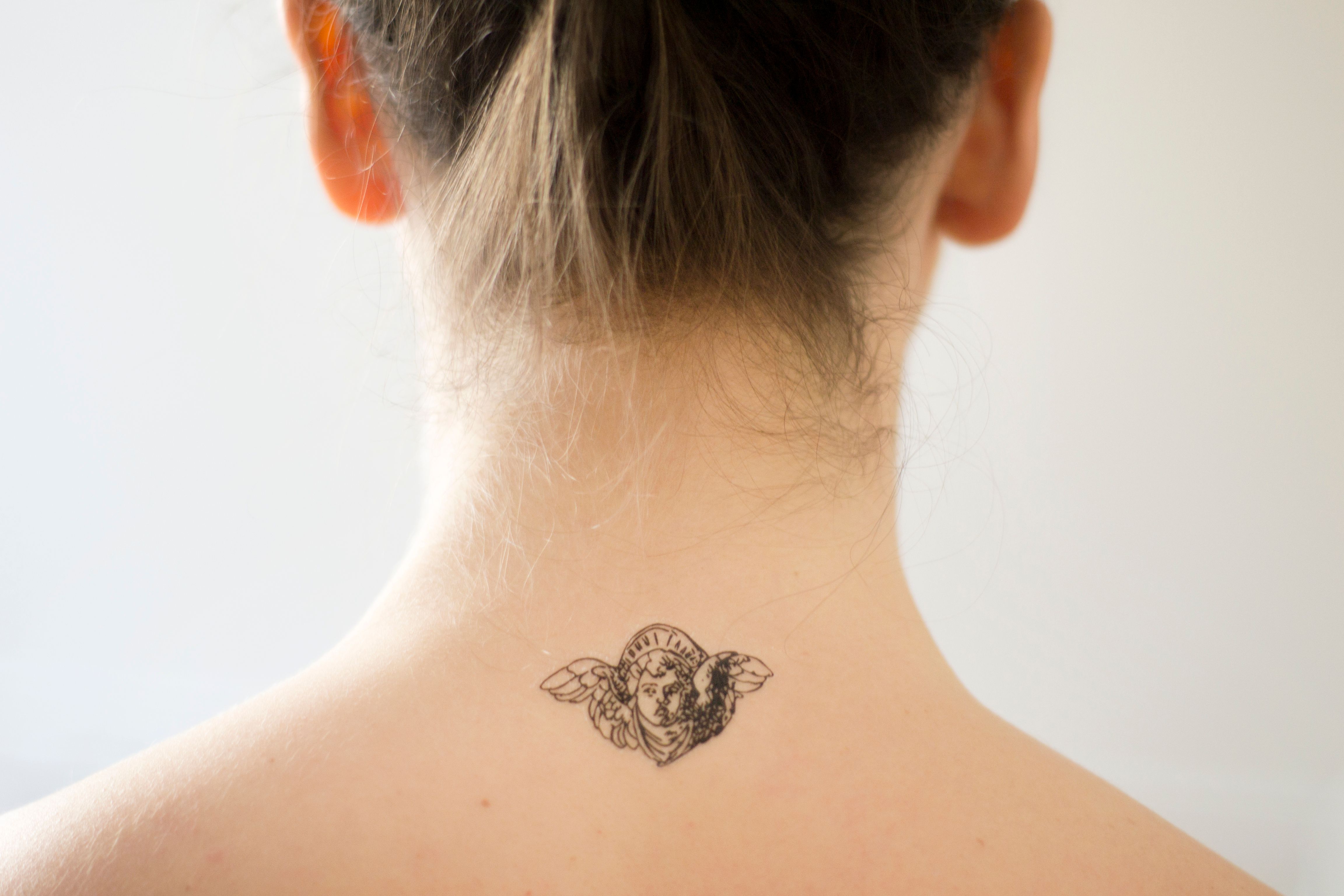 Ainsi les petits tatouages dange sont excellents car ils peuvent être tatoués presque nimporte où sur le corps à la fois derrière le cou et sur la poitrine.
